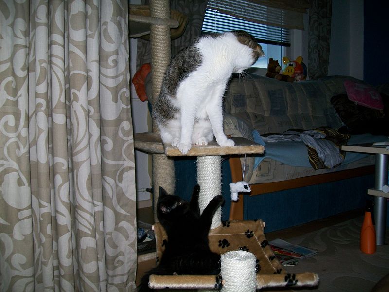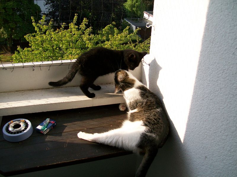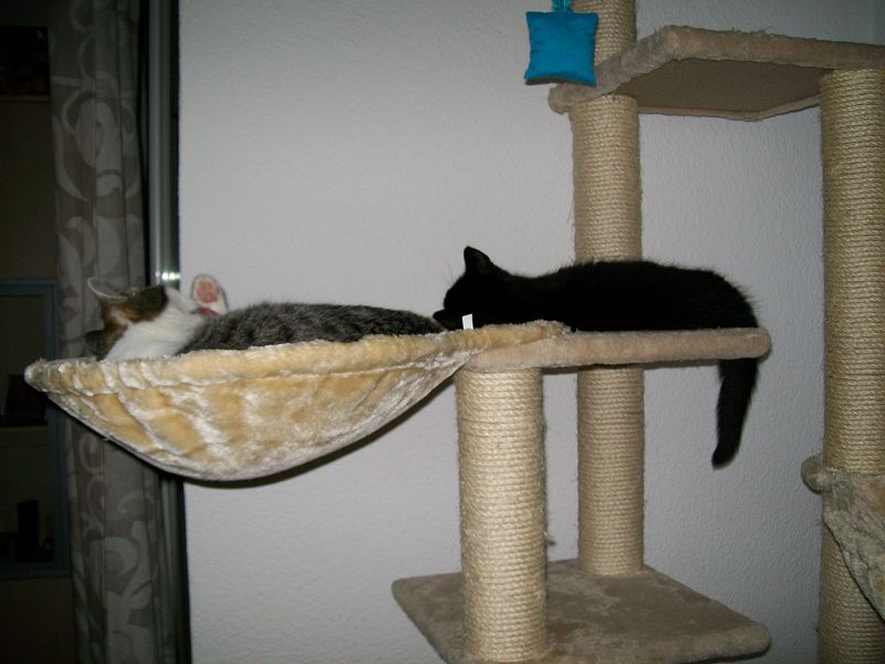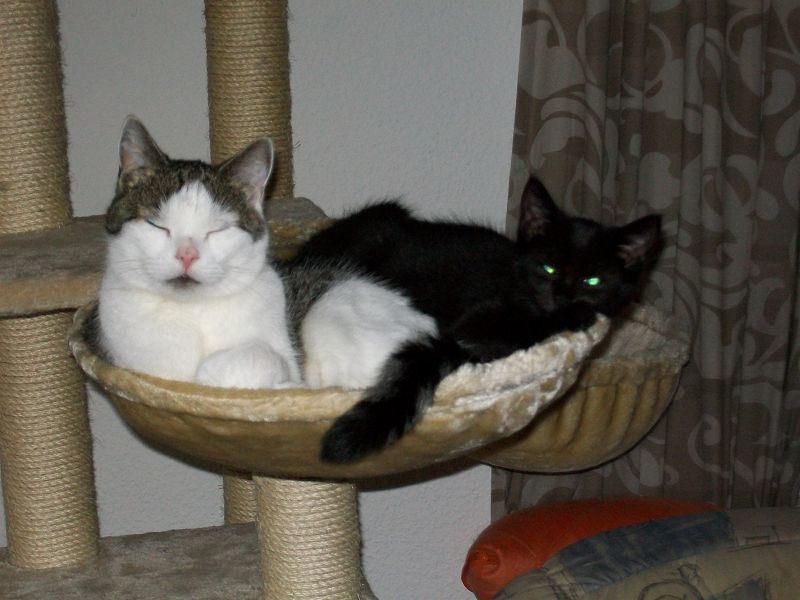 Am ersten Tag hatte mein Kumpel noch ein paar kleine Probleme mit mir,aber die hatten sich dann auch schnell gelegt :) . Mittlerweile teilen wir den Kratzbaum,die Fressnäpfe und er putzt mich auch schon minutenlang.Normalerweise würde eine Katzentoilette für uns reichen,aber die zweite wird auch fleissig benutzt.