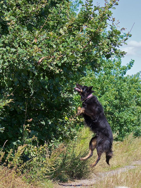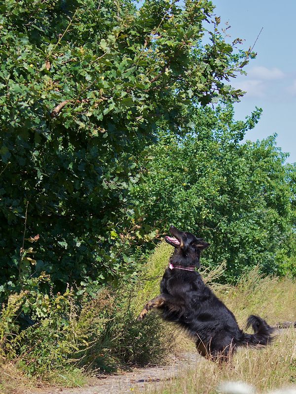 Besonders mit dem fetten roten Kater von nebenan verstehe ich mich prächtig. Ich helfe ihm sogar beim Abspecken. Sobald ich ihn sehe, jage ich ihn zwecks Fettverbrennung und Stärkung seiner Muskeln auf den höchsten Baum. Dummerweise leidet er an temporärer Katzendemenz, denn er weiß zwar, wie er auf den Baum raufkommt, aber hat dann regelmäßig vergessen, wie es runtergeht. Sitzt dann oben auf dem letzten Ast und heult seine Dosenöffner herbei.