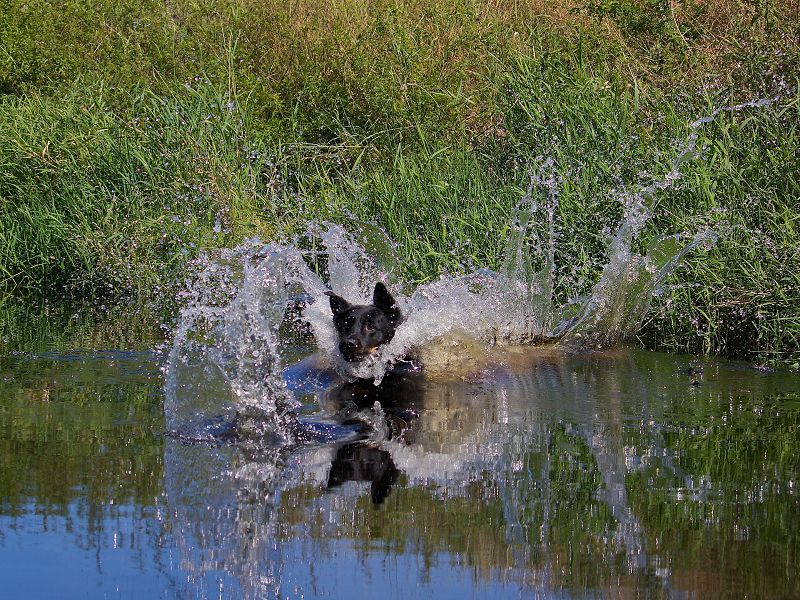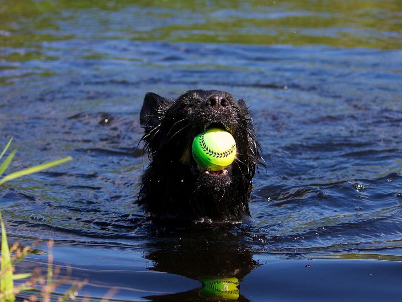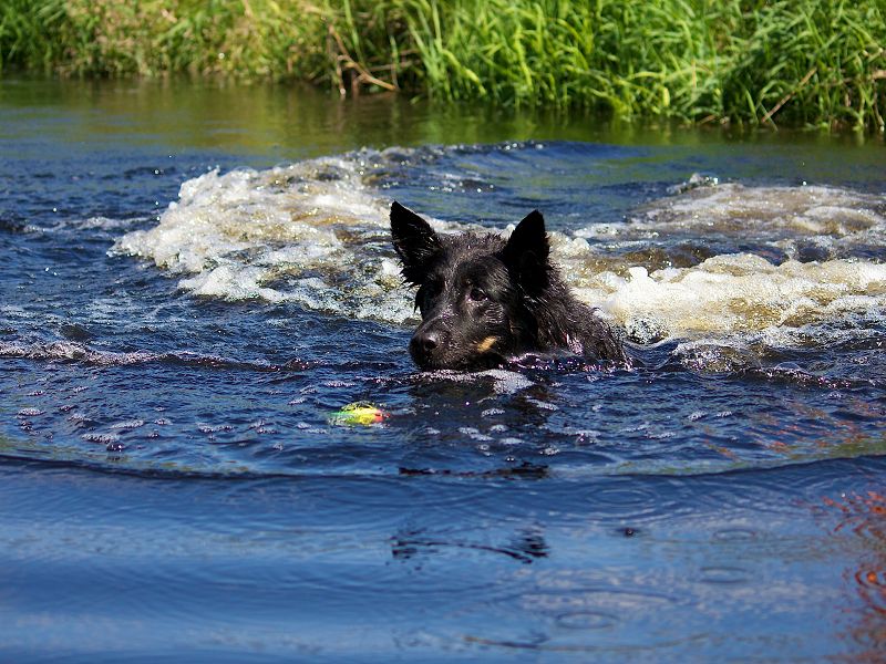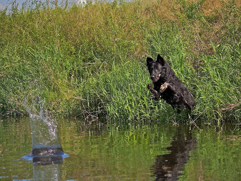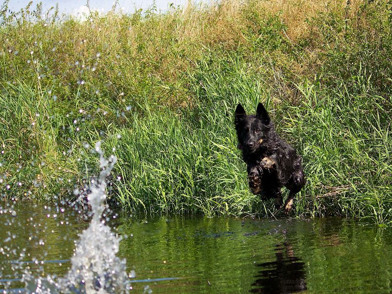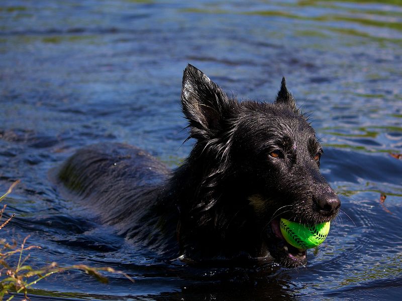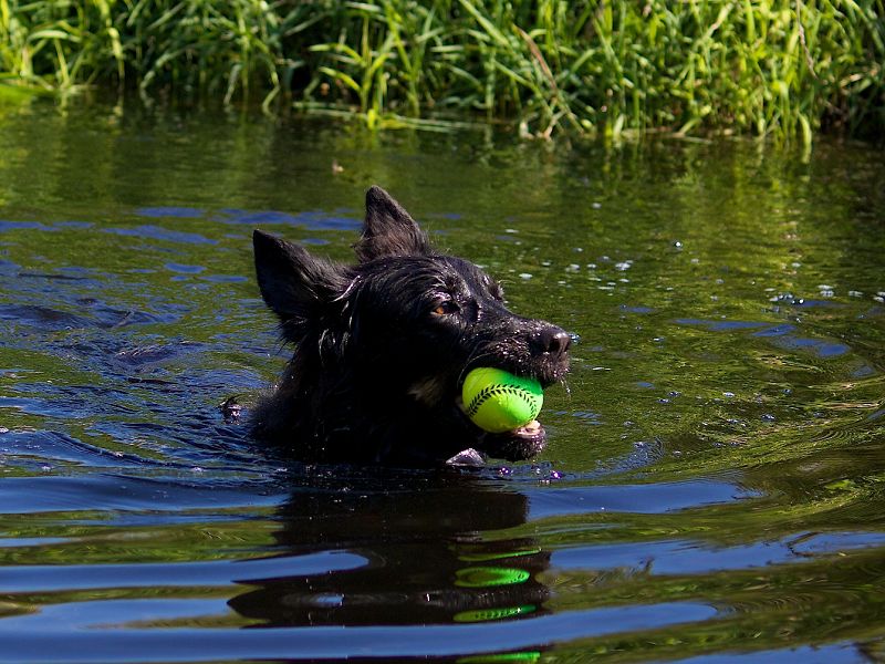 Aber das Schärfste ist: Wenn wir unterwegs an einem Teich vorbeikommen, schmeißt die Schlaftablette doch regelmäßig meinen Lieblingsball ins Wasser. Und ich muss ihn wieder rausholen. Ist der bekloppt oder was? Selber wasserscheu bis zum geht nicht mehr und ich muss die Drecksarbeit machen, bloß damit der sich ne Pause verschafft. Und weil der Schlaffi vom Zugucken so ermattet ist, muss ich das Ding dann auch noch selber nach Hause tragen.