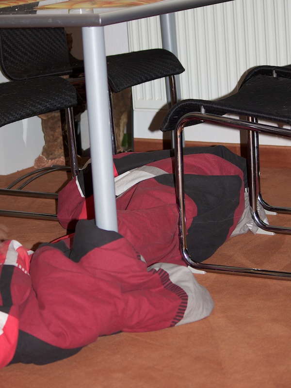 Hab ihm gestern Abend schon mal probehalber sein Bettzeugs untern Küchentisch gepackt. Da kann er von mir aus nachts einparken und so laut schnarchen, wie er will.