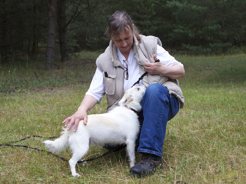 Mit anderen Hunden kommt sie gut aus. Sie spielt und tobt auch gern mit ihnen. Bei uns lebte sie  mit Mingo zusammen. Da ging richtig die Post ab. Wenn Mingo keine Lust mehr hatte, machte sie Spieleaufforderungen an ihn. Es war süß zu beobachten, wie sie ihm dann Stöckchen holte oder ihn vorsichtig zwickte, damit es weitergehen sollte.