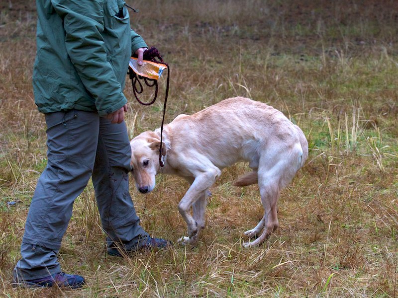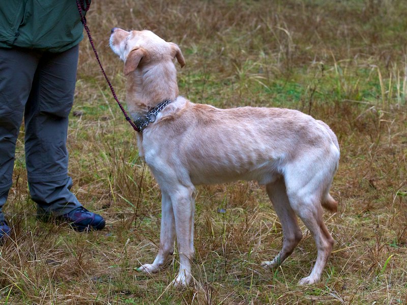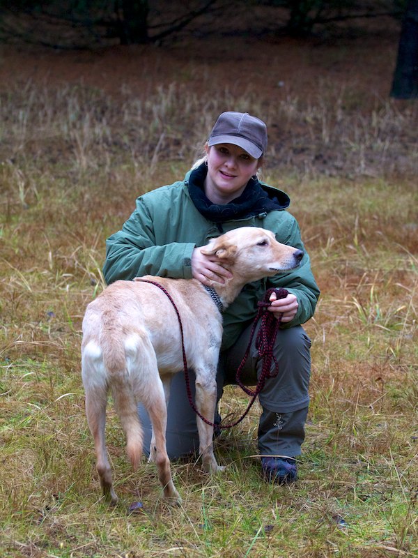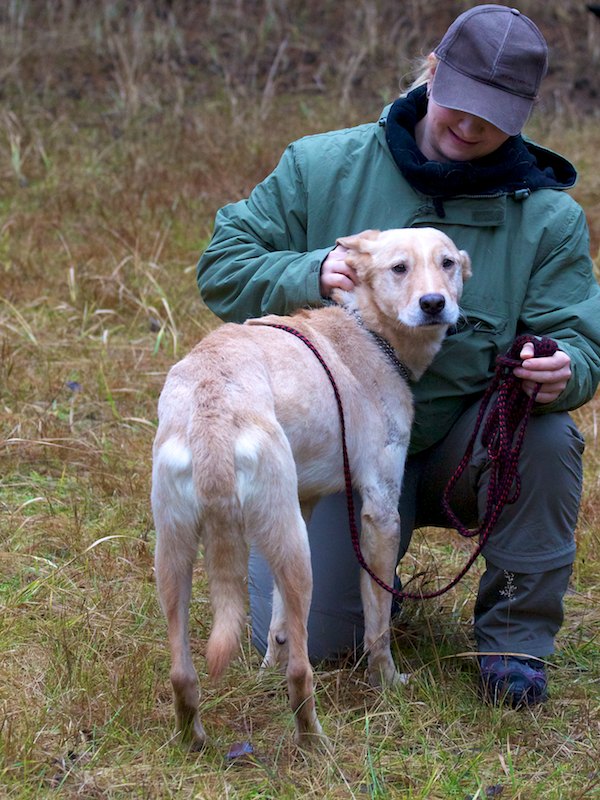 Fünf Tage später wollten wir ihn draußen fotografieren. Da hatte er schon ein wenig mehr auf den Rippen. Doch da er offensichtlich die Kammer, in der er auf dem Schiff gelebt hatte, nie verlassen durfte, konnten wir ihn nicht dazu bringen, sein Zimmer bei uns zu verlassen. Sobald er anderen Untergrund als die glatten Fliesen spürte, konnte er nicht mehr laufen und verweigerte sich. So musste Jasmin ihn ins Gelände tragen, um ein paar Aufnahmen im Freien zu machen.