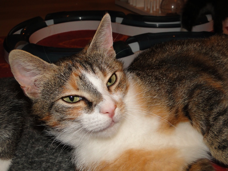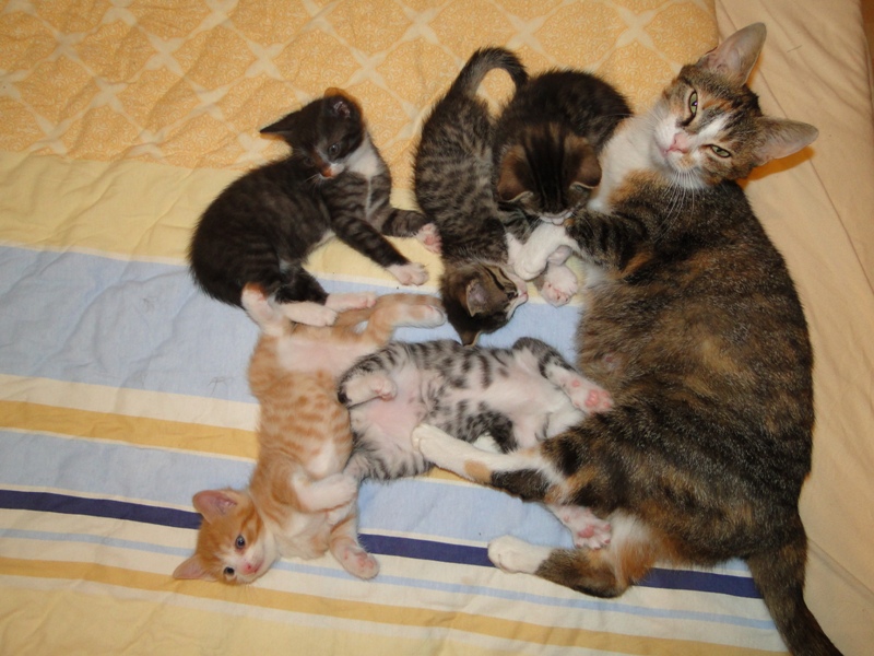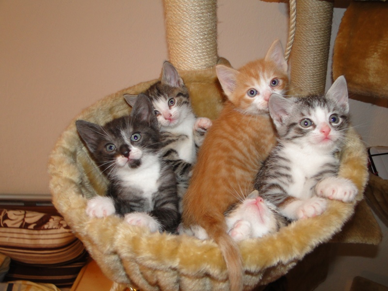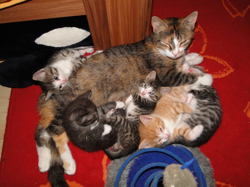 Als sie alt genug waren, kam dann leider die Trennung. Glücklicherweise konnten wir immer zwei der Geschwisterchen gemeinsam vermitteln: Jeannie und Geronimo fanden gemeinsam eine neue Heimat, Merlin und Sammy zogen zusammen nach Brandenburg und Fay durfte gemeinsam mit ihrem Sohn Garfield nach Berlin. Dort hat sie weiterhin eine Pfote drauf, dass ihr übermütiger Sohn in Schach gehalten wird, wenn er wieder einmal besonders frech wird.
